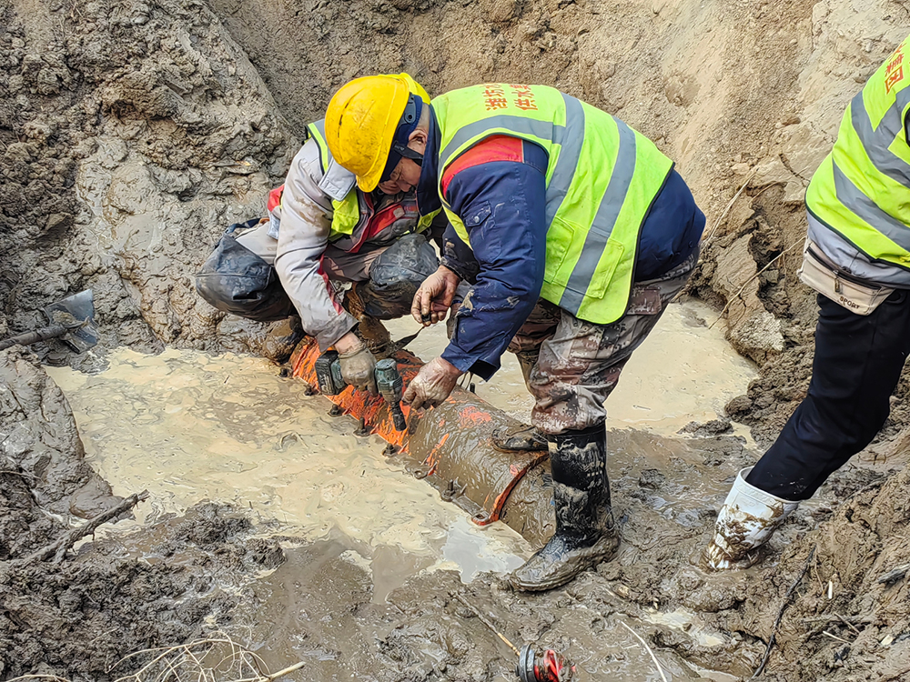 搶修現(xiàn)場,因管線漏水導(dǎo)致路面塌方嚴(yán)重,確認(rèn)漏點(diǎn)后,搶修人員緊急制定搶修方案,同時給下游客戶下停水通知。受現(xiàn)場施工條件所限,挖掘機(jī)清理完上層堅硬的砂石后,剩下的泥土只能用鐵锨一點(diǎn)點(diǎn)挖出。為縮短搶修時間,隊員們冒著零下8℃低溫天氣,全然不顧被泥水打濕的衣服和鞋子,站在冰冷刺骨的泥水里,徒手安裝螺栓。經(jīng)過5小時的連續(xù)奮戰(zhàn),最終比計劃時間提前4小時完成搶修,把因停水給居民帶來的影響降至最低,過往群眾紛紛為搶修隊員點(diǎn)贊。